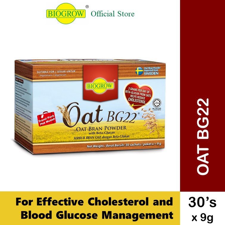 Biogrow Oat Bg22 Bran Powder DoctorOnCall is Malaysias most complete digital healthcare platform to access clinics pharmacies hospitals and health laboratories online. Each daily serving provides 3g bioactive oat beta-glucan with high molecular weight 2200 kDa which ensures the formation of a thick viscous gel in the intestines. Oat BG22 is Your Best Choice Oat BG22 is made from premium Swedish oat bran powder high in 20 beta-glucan soluble fiber developed in a proprietary way that the beta-glucan are essentially preserved in the most natural form therefore retains the highest molecular weight for higher viscosity produced in the upper gut in order to reduce blood cholesterol level.
